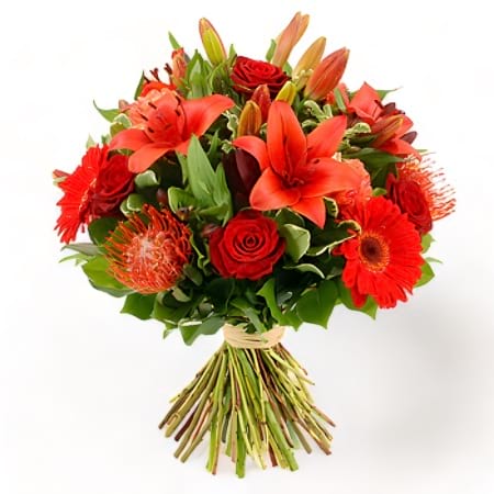 A lovely bouquet of seasonal red toned flowers for the festival seasonal.