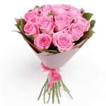 A bouquet of a dozen long stemmed pink roses