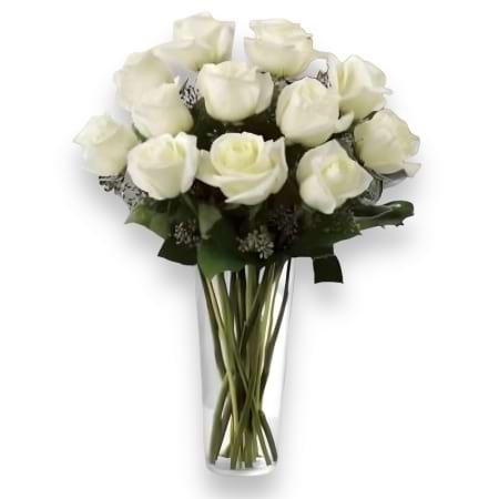 A lovely and classical bouquet of a dozen white roses in a vase. Truly a special delivery to receive as a gift bunch of flowers