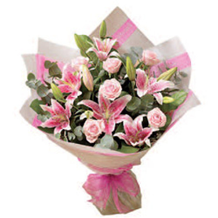 A Beautiful bouquet of Oriental lilies and Roses Wrapped and delivered to that special someone.